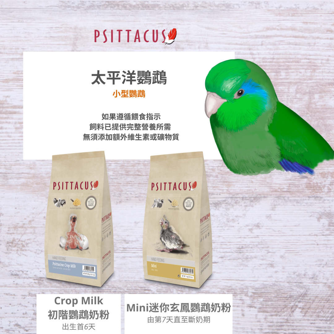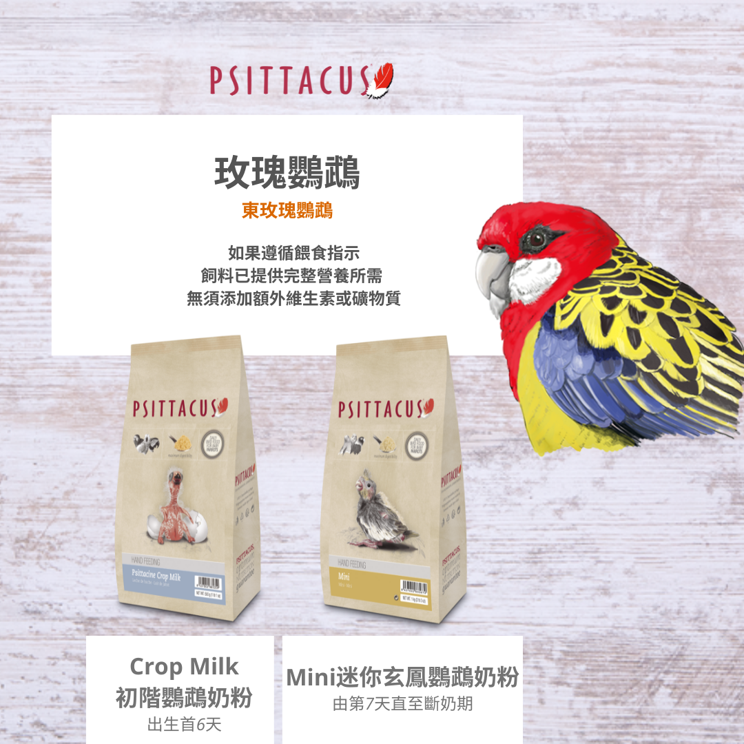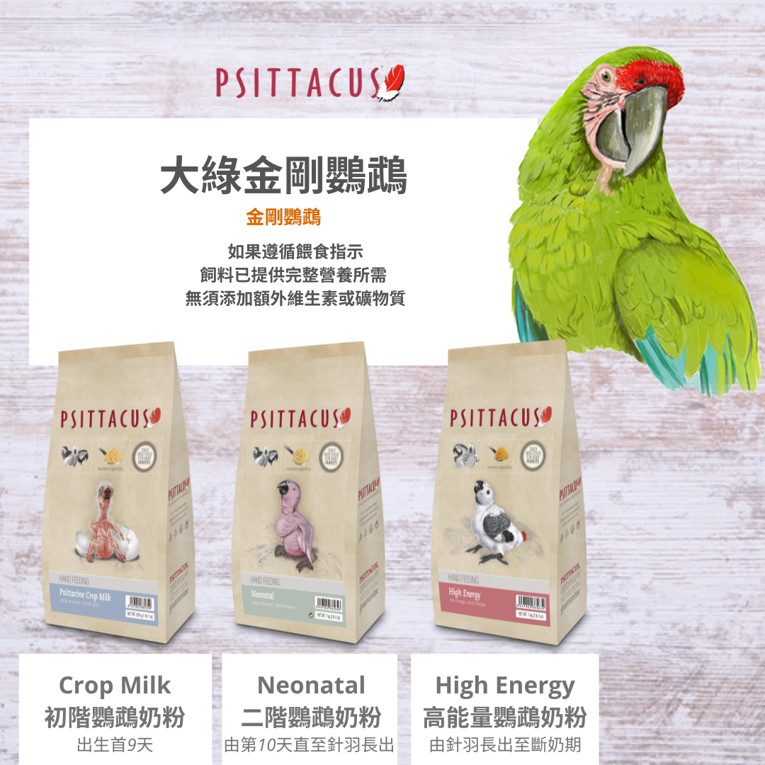 PSITTACUS自設繁殖中心及研發中心,透徹了解每個品種鳥類或鸚鵡的所需並明白為每個品種提供最合適的飲食非常重要。PSITTACUS 系列的配方就著研究結果,專門為了向幼年鸚鵡提供最佳營養而設計。作為合成鳥糧奶粉無需提供額外補充營養,包含鳥類所需營養健康成長。