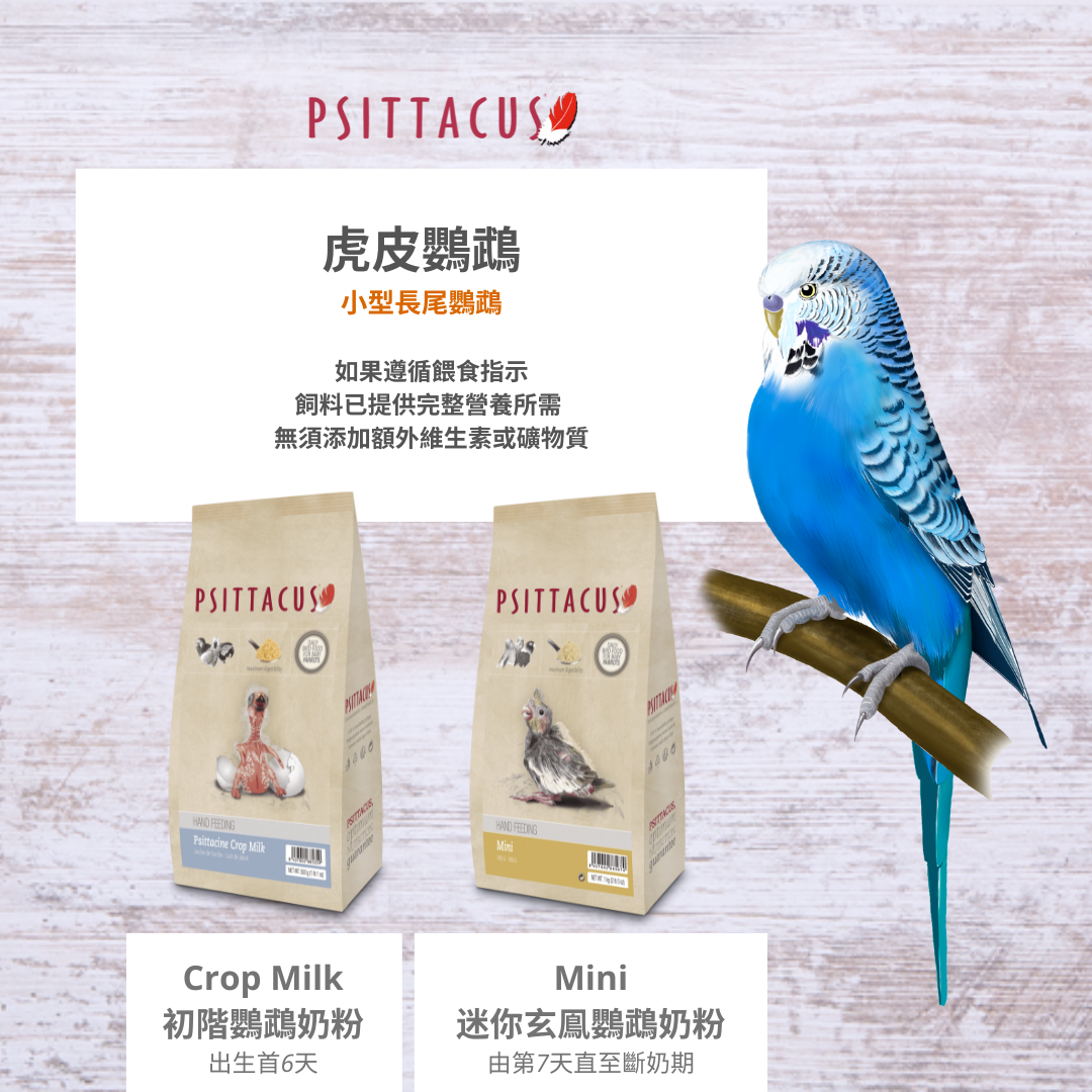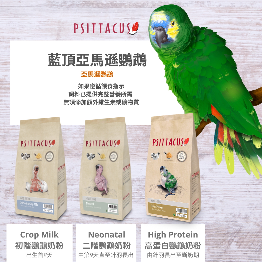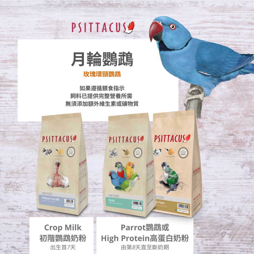 PSITTACUS自設繁殖中心及研發中心,透徹了解每個品種鳥類或鸚鵡的所需並明白為每個品種提供最合適的飲食非常重要。PSITTACUS 系列的配方就著研究結果,專門為了向幼年鸚鵡提供最佳營養而設計。作為合成鳥糧奶粉無需提供額外補充營養,包含鳥類所需營養健康成長。